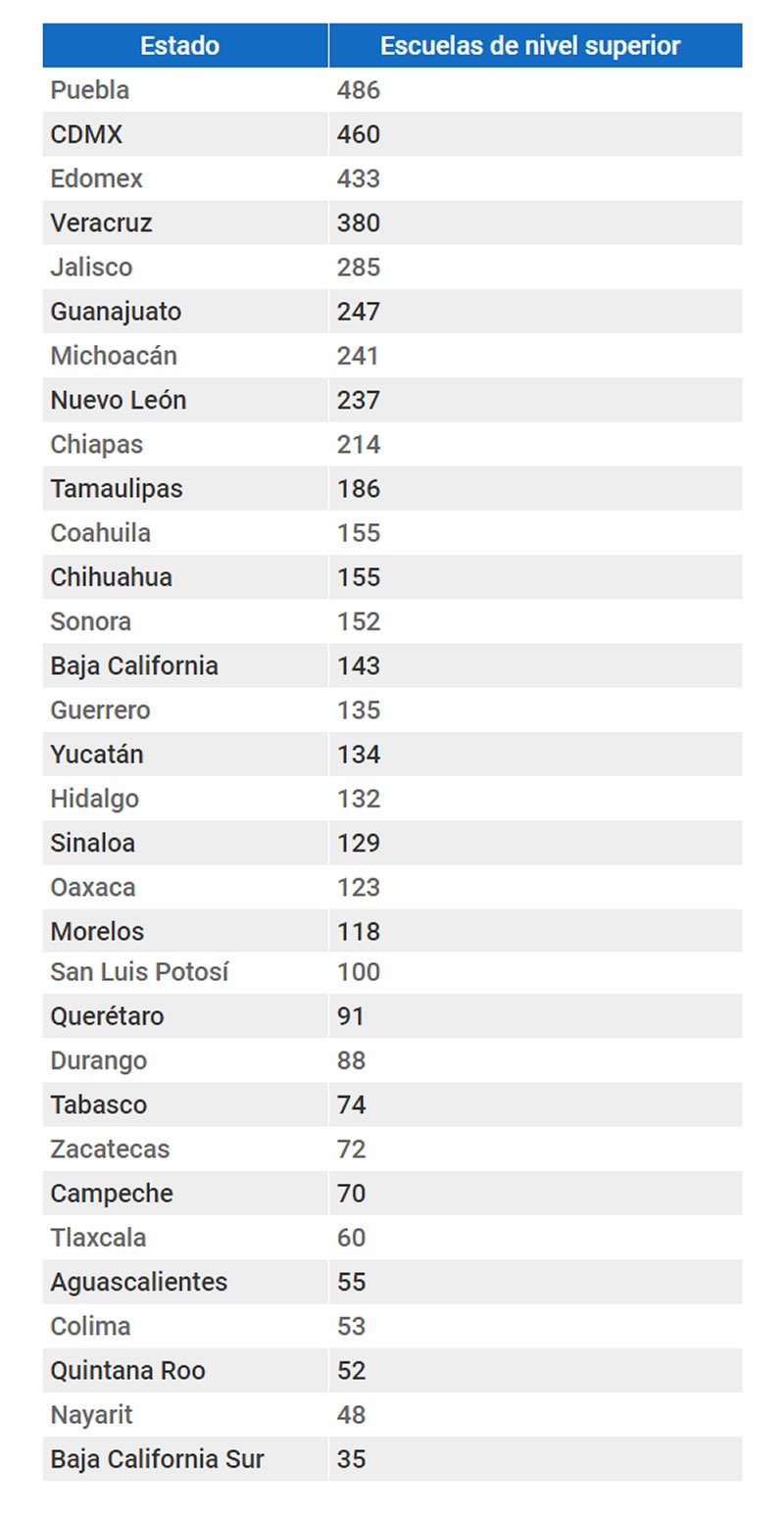 Estados del país concentran el 42.8% de las escuelas de nivel superior en el país